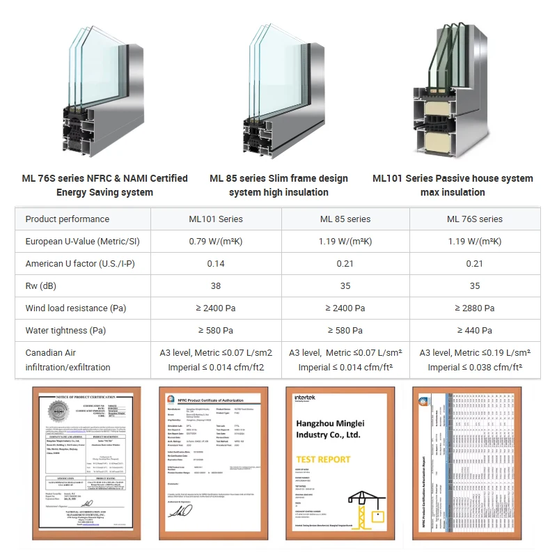 Hangzhou Minglei Industry Co., Ltd. is a professional supplier which engaged in the research, development, sale and service of energy efficient aluminum windows and doors, vinyl & upvc windows and doors, curtain wall, louver etc. We are dedicated to energy efficient, eco-friendly, and cost effective system windows and doors, and through our research & development, having made great achievements in the performance category such as thermal insulation, structural strength, weather proofing, sound insulation, and condensation resistance.